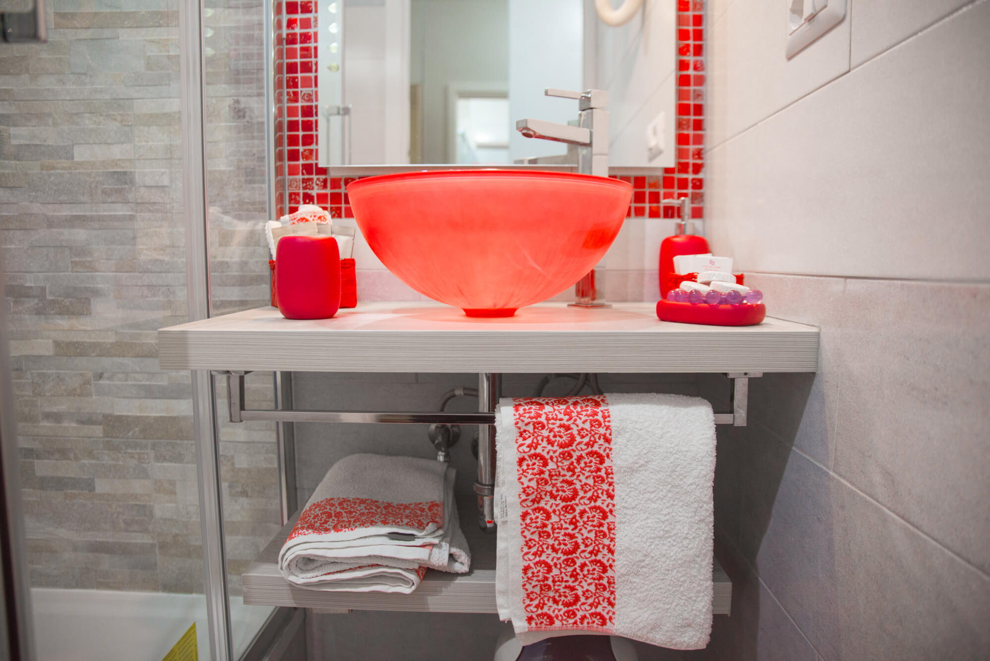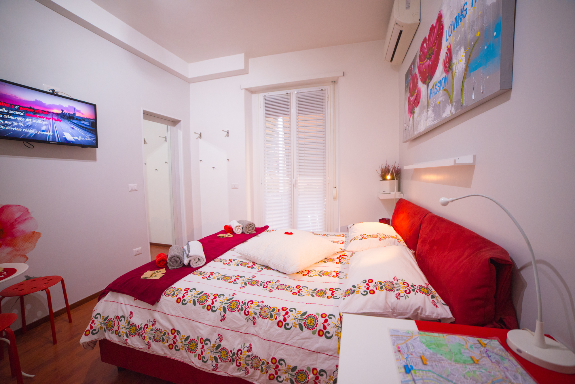 Con bagno privato all’interno, la stanza è accessoriata di cassaforte elettronica, TV Led 32’, Wifi gratuito H24, aria condizionata e riscaldamento termoautonomo. Il bagno, con il suo mosaico abbinato allo stesso colore della camera, è fornito di tutti i servizi: asciugacapelli, asciugamani, box doccia con un piccolo stendino all’interno. Oltre al sapone per le mani, lo shampoo e il balsamo troverete inoltre tutta la biancheria da bagno.